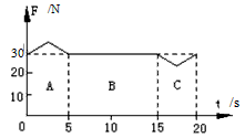 | 某同学利用DIS研究电梯在竖直方向的运动。在电梯中挂一质量为3kg的重物,用力传感器测出悬绳的拉力F,得到如图所示的F-t图象。 |