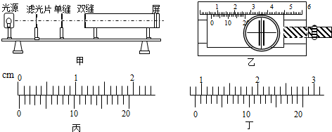 某同学用图甲所示的实验装置做《用双缝干涉测量光的波长》的实验,他用带有游标尺的测量头(如图乙所示)测量相邻两条亮条纹间的距离△x.转动测量头的手轮,使分划板的中心刻线对齐某一条亮条纹(将这一条纹确定为第一亮条纹)的中心,此时游标尺上的示数如图丙所示,再转动测量头的手轮,使分划板的中心刻线对齐第6亮条纹的中心,此时游标尺上的示数情况如图丁所示,则图丁的示数x2=______?mm.如果实验所用双缝之间的距离d=0.20mm,双缝到屏的距离L=60cm.根据以上数据可得出光的波长λ=______m(保留2位有效数字).