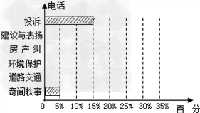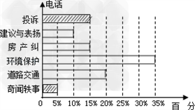 某晚报“百姓热线”一周接到热线电话记录为:奇闻轶事5%,道路交通20%,环境保护35%,房产纠纷15%,建议与表扬10%,投诉15%. |