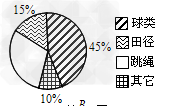 | 某校为了解学生喜爱的体育活动项目,随机抽查了100名学生,让每人选一项自已喜欢的项目,并制成如图所示的扇形统计图.如果该校有1200名学生,则喜爱跳绳的学生约有( )人. |
