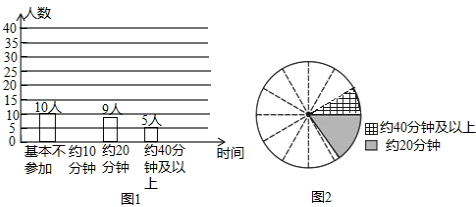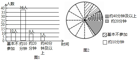 | 某校学生会准备调查初中九年级同学每天(除课间操外)的课外锻炼时间. (1)确定调查方式时,甲同学说:“我到1班去调查全体同学”;乙同学说:“我到操场上去询问参加锻炼的同学”;丙同学说:“我到九年级每个班去随机调查一定数量的同学”.请你指出哪位同学的调查方式最为合理; (2)他们采用了最为合理的调查方法收集数据,并绘制出如图1所示的条形统计图和如图2所示的扇形统计图,请将其补充完整;(注:图2中相邻两虚线形成的圆心角为30度.) (3)若该校初中九年级共有240名同学,请你估计其中每天(除课间操外)课外锻炼时间不大20分钟钟的人数,并根据调查情况向学生会提出一条建议. ![]() |