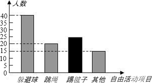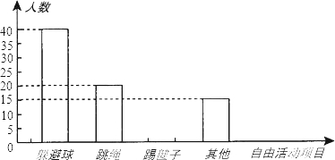 某学校为丰富课间自由活动的内容,随机选取本校100名学生进行调查,调查内容是“你最喜欢的自由活动项目是什么”,整理收集到的数据,绘制成直方图,如图所示.①喜欢“踢毽子”的