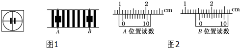 利用双缝干涉测光的波长的实验中,双缝间距d=0.4mm,双缝到光屏间的距离l=0.5m,用某种单色光照射双缝得到干涉条纹如图1所示,分划板在图1中A.B位置时游标卡尺读数也由图2中所给出,则:
