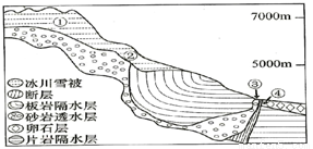 某著名品牌矿泉水在广告中宣传:该矿泉水源自海拔7000多米的高山冰雪融水下渗至冰川砂层而成地下水,自此进入地下水循环,历经砂砾石层的层层过滤,并在透水层处自然涌出。据材料推测,试问该矿泉水的取水源可能在右图中哪个位置出现(?? )