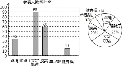 某中学开展阳光体育活动,举办了跳绳、踢毽子、立定跳远、摸高、单足跳、健身操六项比赛(每个同学限报一项).学生参赛情况如两个统计图所示:认真观察上面两个统计图后,回答下