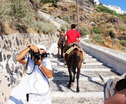 ? 圣托里尼的旅游高峰时期,每天有5艘游轮将1200名游客送到岛上。圣托里尼以丘陵地形为主,有些地方台阶较多,车辆难以通行,这时就需要驴来运送人们。驴的工作任务非常繁重,每天的工作时间很长,且一周七天没有休息,运送游客的过程中没有防晒措施也没有水源补给,可见驴的不容易。