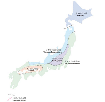 ?太平洋侧气候:包括了本州东海岸、南四国和九州大部分地区。夏季受东南季风影响,梅雨强台风多。冬季则降雪较少。 濑户内海式气候:包括了山阳地方、北四国、近畿与九州局部地区。这里天气常是晴天,降雨量少,不时遭受旱灾之苦。