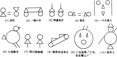 请你以给定的图形 (两个圈、两个三角形、两条平行线段)为构件,构思独特且有意义的图形,并写上一两句贴切、诙谐的解说词.(至少设计三幅). |