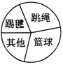 | 如图表示某班参加课外活动的总人数,跳绳的人数占30%,表示踢毽的扇形圆心角是60°,踢毽和打篮球的人数之比是1:2,那么表示参加“其他”活动的人数占人数的百分比是多少? |