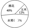 | (1)在扇形统计图中的括号内填上适当的数据; (2)棉花占40%,表示它所占扇形的圆心角是多少度? (3)水稻种了240公顷,那么棉花种了多少公顷? (4)该村农作物种植的总面积是多少公顷? |