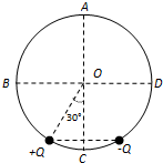 如图所示,AC、BD为圆的两条互相垂直的直径,圆心为O,半径为R.电荷量均为Q的正、负点电荷放在圆周上,它们的位置关于AC对称,+Q与O点的连线和OC间夹角为30°.下列说法正确的是( )A.O点的场强大小为