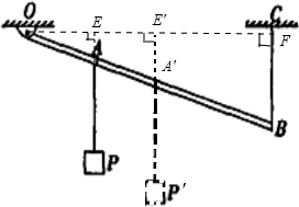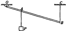如图所示,轻质杠杆 OB长70cm,能绕O点转动,B端以细绳BC悬与C点.有一个体积为100cm3的铸铁块 P通过滑环挂在A点距O点 20cm.由于杠杆 OB为稍倾斜状态,滑环由A向B端匀速滑动,滑动速度为1.5cm/s,细绳 BC最大承受力为 4.9N.问滑环从A开始滑动起,经过多长时间后细绳断裂?(铸铁的密度为7.0×103 kg/m3)