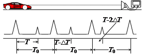如图所示为超声波测速装置,该仪器可以向正在平直公路上匀速行驶的汽车发出一束短促的超声波(下图中振幅较大的波形),并且能接收到反射回来的超声波(下图中振幅较小的波形),将两种波形显示在屏幕上,相邻波形间的时间间隔如图所示,其中T 0 和△T为已知量。超声波的速度为v 0 ,其发射方向与汽车行驶方向在同一直线上,则这辆车的行驶速度为(???? )