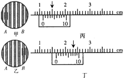 如图所示,在“用双缝干涉测量光的波长”的实验中,第一次分划板中心刻度线对齐A条纹中心时如图甲,游标卡尺的示数如图丙所示;第二次分划板中心刻度线对齐B条纹中心时如图乙,