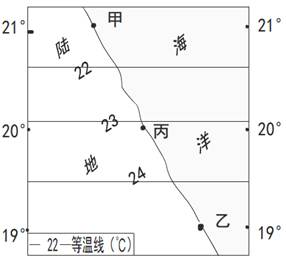 气温的日变化一般表现为最高值出现在14时左右,最低值出现在日出前后。图示意某区域某日某时刻的等温线分布,该日丙地的正午太阳高度达到一年中最大值。读图回答题。小题1:下