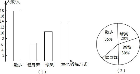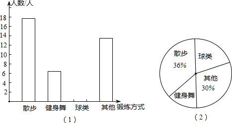 社区干部老王对本小区退休老人的晨练情况进行了抽样调查,他根据采集到的数据绘制了下面的统计图,请你根据图中提供的信息回答下列问题. (1)将图(1)中“球类”部分图形补充完整;(2)在图(2)中求出“其他”部分所对应的圆心角度数;(3)采用“健身舞”锻炼方式的人数占调查人数的百分比为______;“球类”锻炼方式的人数占调查人数的百分比为______. |