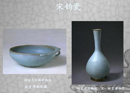 ?钧窑:多为蓝白色釉,有窑变色,但是没同样的钧瓷,每件都不一样,现在的窑变都是做出来的,不像钧瓷那样的随机。很生硬。