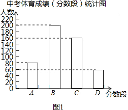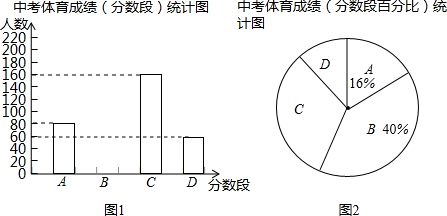 为了解宁波市九年级学生中考体育成绩情况,现从中抽取部分学生的体育成绩进行分段(A:30分、B:29~24分、C:23~18分、D:18~0分)统计结果如图1、图2所示.根据上面提供的信息,回