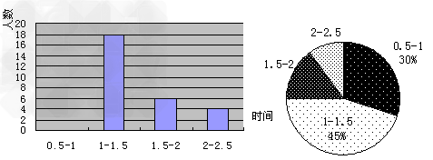 | 为了了解某市在减轻学生作业负担的工作上的落实情况,该市教育局对某校某班每个同学晚上完成作业的时间进行了一次调查统计,并根据收集的数据绘制了如图所示的两幅不完整的统计图,请你根据图中提供的信息,完成下面的问题 (1 )该班共有多少学生? (2 )将图中的条形统计图补充完整 (3 )求作业完成时间在0.5-1 小时的部分对应扇形圆心角是多少度? (4 )如果该校七年级共有1000 名学生,请估计七年级学生完成作业时间超过1.5 小时的大约有多少人? |