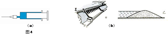 物理知识在生产和生活中有着广泛的应用。在图4(a)中,针筒吸取药液利用的是的知识;针尖做得尖锐是为了能产生很大的。如图4(b)所示,拦河大坝设计成下宽上窄形状