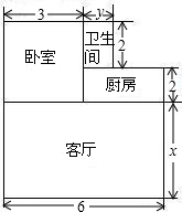 最佳答案: 客厅的面积为6xm2,厨房的面积为6m2,卫生间的面积是2ym2,卧室的面积是12m2;