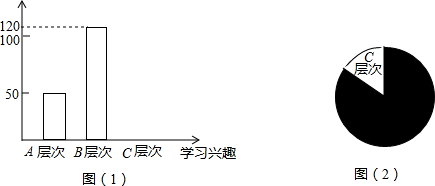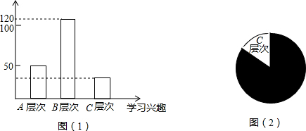 | 学生的学习兴趣是每位教师非常关注的问题,为此,我市某校教师对该校部分学生的学习兴趣进行了一次抽样调查(把学生的学习兴趣分为三个层次,A层次:很感兴趣;B层次:较感兴趣;C层次:不感兴趣)并将调查结果绘制成了图(1)和图(2)的统计图(不完整),其中A层次的人数所占比例为25%,请你根据图中提供的信息,解答下列问题: (1)此次调查中,共调查了______名学生; (2)将图(1)补充完整; (3)求出图(2)中C层次所在扇形的圆心角的度数; (4)根据抽样调查结果,请你估计该校2000名学生中大约有多少名学生对学习感兴趣.(包括A层次和B层次) ![]() |