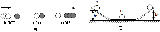 将一个两端翘起、中间水平的轨道固定在水平桌面上,取两个相同的台球A、B,将B球静置于轨道的滴水平部分,A球置于轨道左端斜面上某处,测出该点到水平桌面的高度h1,如图乙所示,释放A球,撞击后,A球静止,B球向前运动并冲上轨道右端斜面能到达的最高点,测出该点的高度h2.通过比较h2与h1的大小关系即可作出判断.
