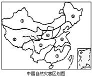 阅读下图与材料后,回答问题: 材料一:(1)2006年是1998年我国发生特大洪水以来遭受自然灾害最为严重的一年,全国各类自然灾害共造成2374人死亡,失踪568人,紧急转移安置人口1324万多人,倒塌房屋202万多间,因灾直接经济损失2177亿多元。 (2)2006年10月11日是联合国倡导的第17个“国际减灾日”,其主题是“减灾始于学校”。 材料二:中国自然灾害区划图 (1)我国当前最主要的自然灾害是: A.寒潮 B.旱涝灾害 C.台风 D.沙尘暴 (2)下列发生在2006年的事件中,属于自然灾害的事件有:(多项选择) A.7月22日,云南盐津发生5.1级地震 B.7月13日以来山西运城市9县区先后出现乙脑疫情 C.11月14日,添加苏丹红的“红心”鸭蛋事件 D.8月10日第8号超强台风“桑美”在浙江省登陆 (3)在上图中,区域①与区域⑥最主要的自然灾害是: A.荒漠化与旱涝灾害 B.泥石流与霜冻 C.滑坡与风暴潮D.旱灾与地震 (4)受风暴潮灾害影响的主要区域是图中的区域 (数字),水土流失最严重的区域 (数字),泥石流最严重的区域是 (数字),以上地区造成泥石流和水土流失加剧的人为原因是 。 |