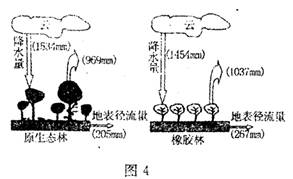 云南省某地为扩大橡胶种植,一直在砍伐木原生态林。橡胶林涵养水源能力很差,为保证橡胶产量,需要扩大间距,控制单位面积株数,图4为原生态林和橡胶林的水循环示意图。据此,回