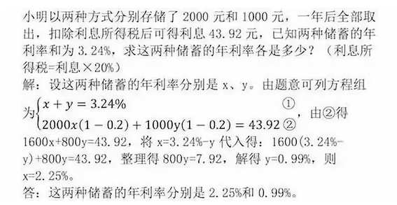 【思路点拨】本题两种储蓄的年利率之和为3.24%,由此可得到第一个等量关系x+y=3.24%,再由两种储蓄的利息之和可得第二个等量关系,列方程组求解即可。