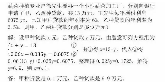 【思路点拨】本题的等量关系:甲种贷款+乙种贷款=13万元;甲种贷款的年利息+乙种贷款的年利息=6075元。变式拓展: