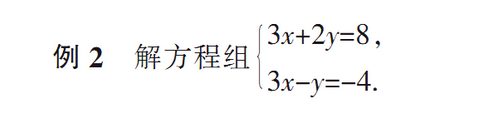 错解:两式相减,得2y-y=8-4,解得y=4,以下略.剖析:两式相减时,方程的左右两边进行的运算是整式的减法,应添加括号.括号前是“-”,去括号时应注意改变括号内各项的符号.正解:两式相减,得(3x+2y)-(3x-y)=8-(-4),去括号,得3x+2y-3x+y=8+4,合并同类项,得3y=12,解得y=4.把y=4代入3x+2y=8,得x=0.所以方程组的解是x=0,y=4.