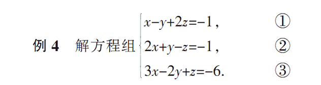 接下来就不知道该怎么办了.剖析:解方程组的基本思想是“消元”,把三元变两元,把两元变一元.把三元变两元时,应认准消去哪一个元,不能 “三心二意”.比如本题可以认准消去y或消去z.正解:①+②得3x+z=-2,②×2+③得7x-z=-8,联立得: