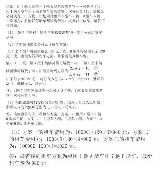 【思路点拨】(1)本小问两个等量关系均可利用货物的总吨数等于两种车型所运货物吨数之和,每种车型所运货物的吨数等于该种车的数量乘以每辆车装满货物时可运输的货物吨数,列出方程即可。(2)根据货物的总吨数等于两种车型所运货物吨数之和列出方程,求解即可。(3)总费用等于A型车的总费用加上B型车的总费用,比较三种方案的费用得出最省钱的租车方案。